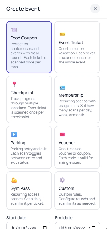 Kaheksa: Toidutalong, Pilet, Kontrollpunkt, Liikmekaart, Parkimine, Vautšer, Jõusaali pass ja Kohandatud. Igaühel on oma valideerimisreeglid, töölaud ja aruande kujundus.