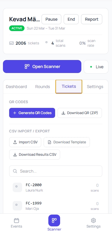 Skannimismäär, tunnipõhine jaotus, voorude ülevaade, piletipõhine kokkuvõte. CSV eksport.