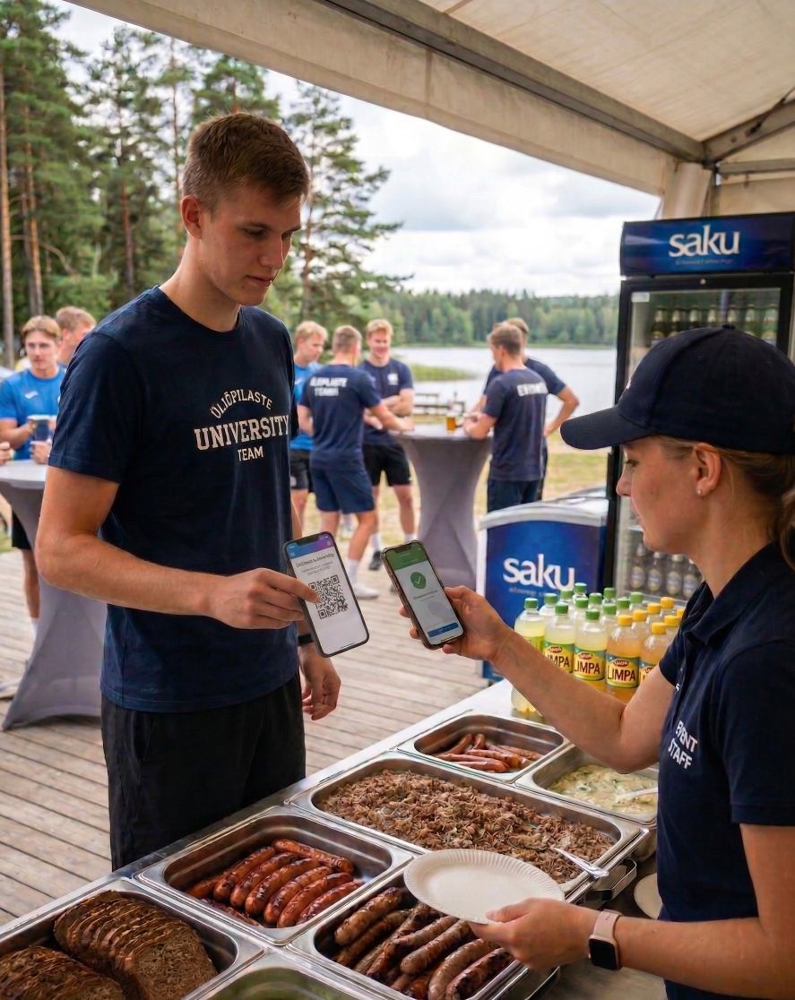 Iga osaleja saab ühe QR-koodi kogu ürituse ajaks. Töötaja skannib seda igal toidukorral. Süsteem jälgib, kes sõi, ja takistab topeltskannimist vooru kohta.