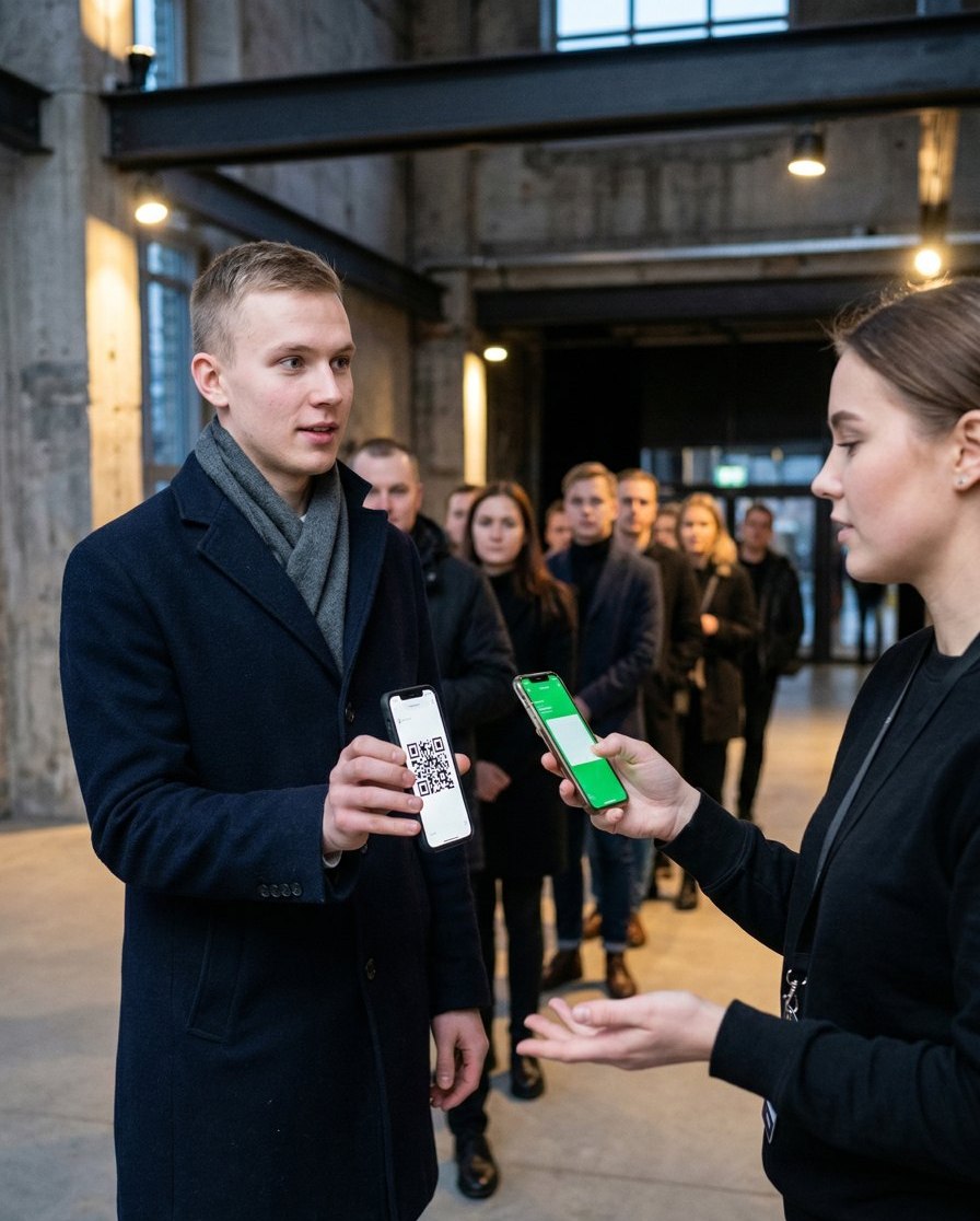 Töötaja skannib QR-pileteid uksel oma telefoniga. Kohene roheline või punane tulemus. Äppi ega eriseadmeid pole vaja.