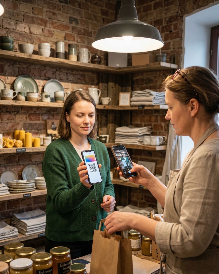 Genereeri vautšerikoodid väärtusega. Kliendid näitavad koodi poes, töötaja skannib lunastamiseks. Iga vautšer töötab üks kord.